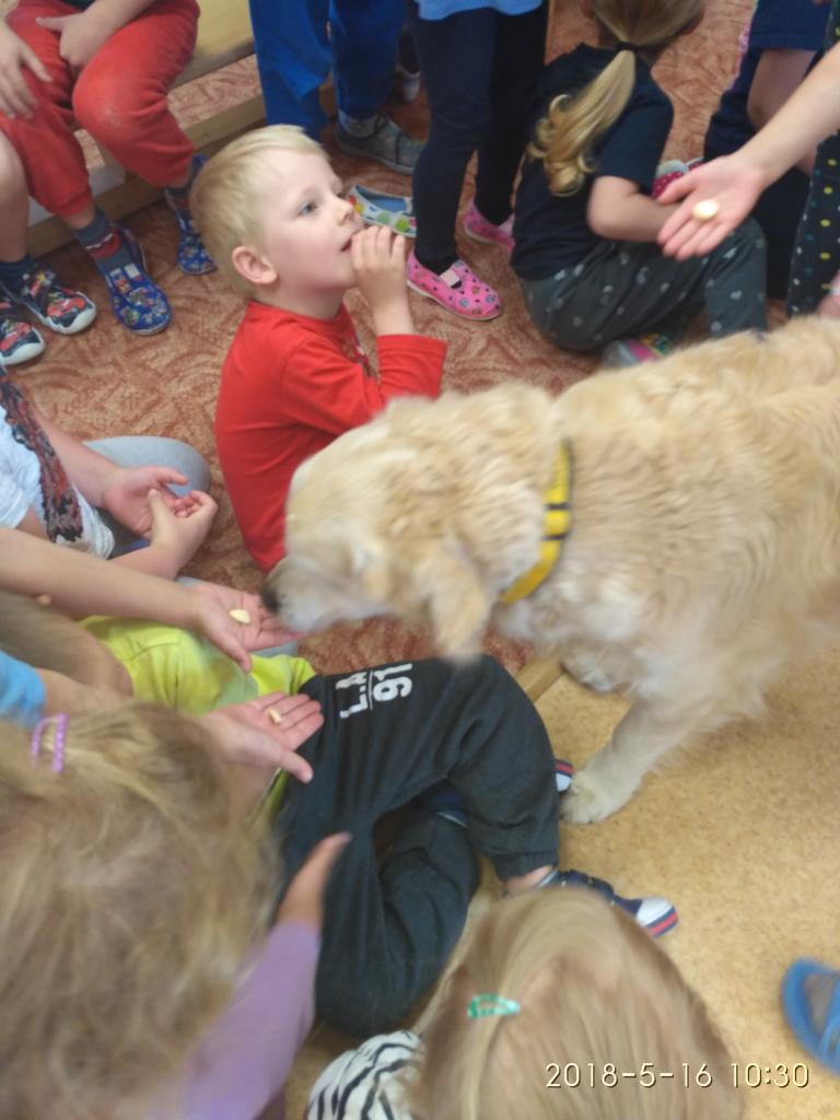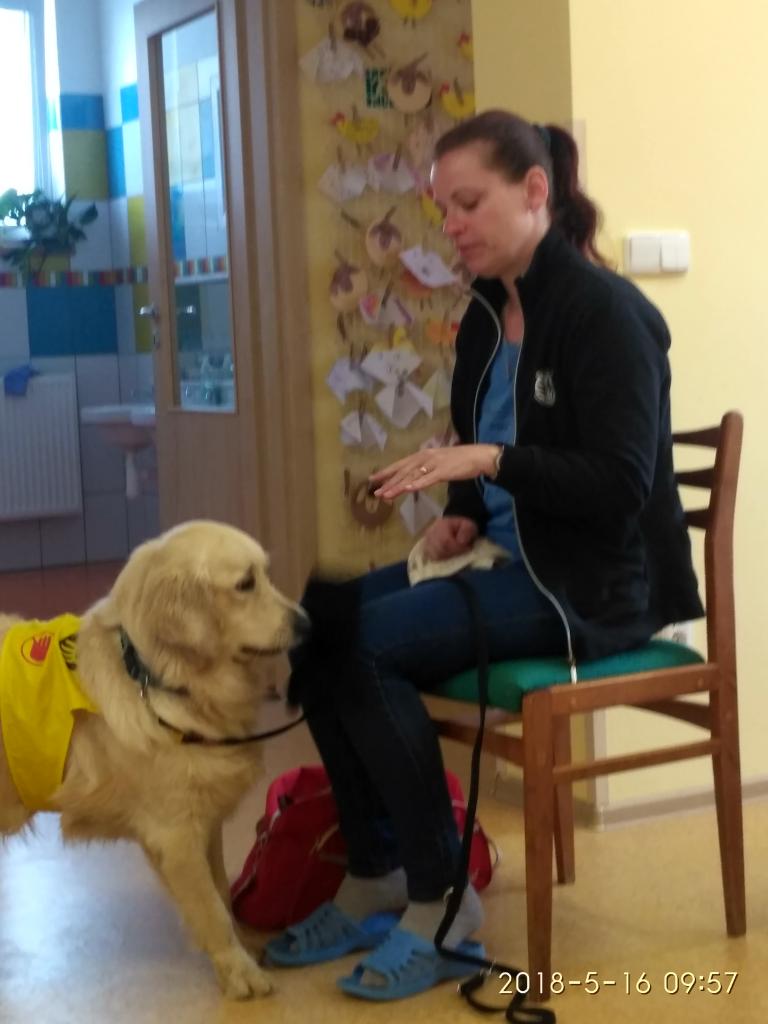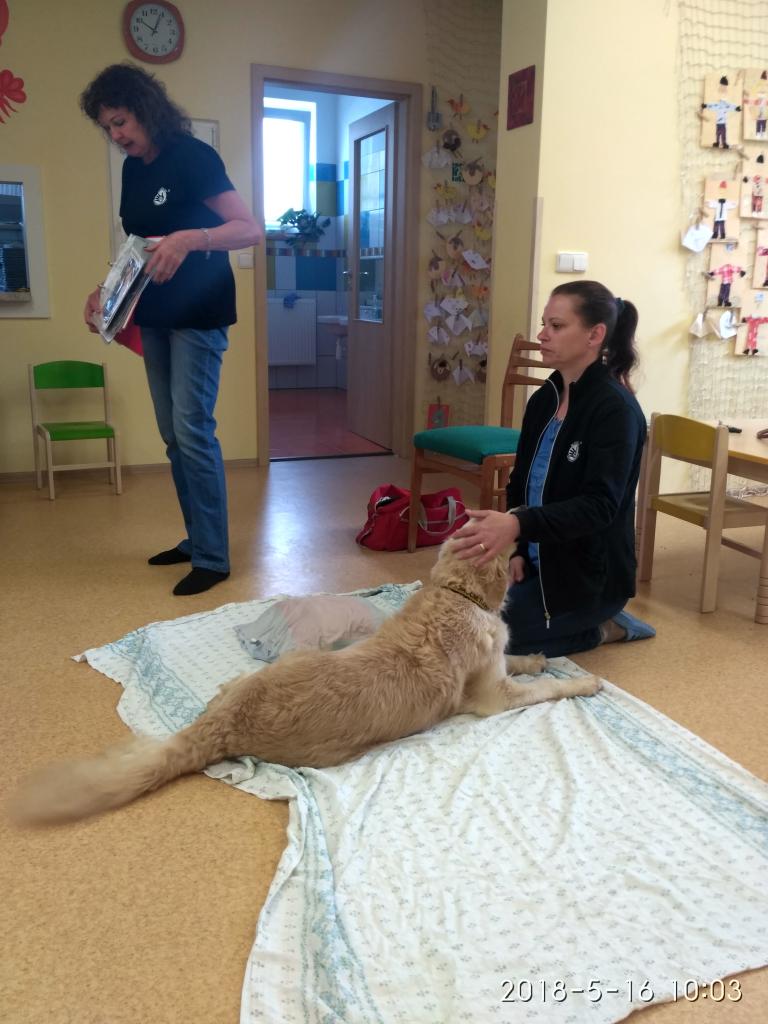 Návštěva Pomocných tlapek v MŠ. Ukázky výcviku a polohování dětí.