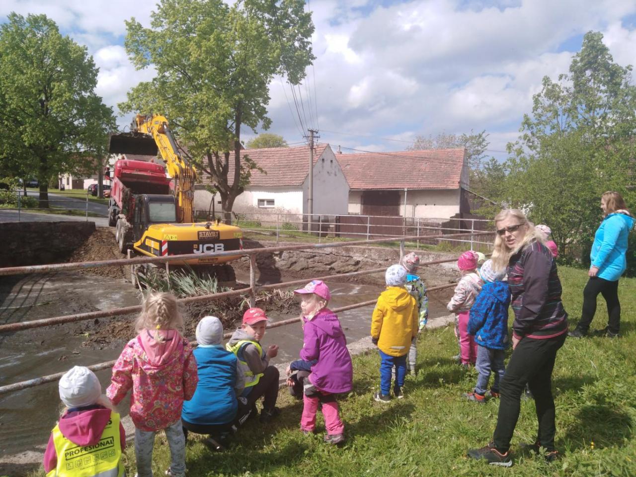 Vycházka k rybníku na návsi. Pozorování bagru při práci.